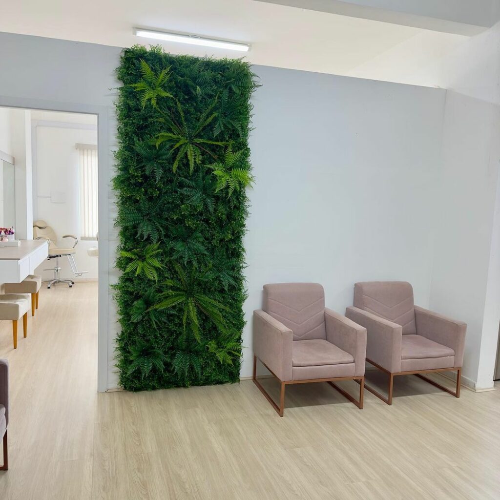 A quantidade de luz natural que a parede recebe é importante. Algumas plantas artificiais podem parecer mais realistas sob iluminação adequada, enquanto outras se destacam em ambientes com luz difusa.